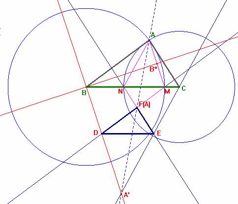 Si consideramos el triángulos isósceles ABM; (BA=BM) y sobre la base AM, su punto medio B*, entonces la recta BB* será la bisectriz del ángulo <A del triángulo ABC y, como esta recta es perpendicular al lado AM, lo será también a la recta BD. Por tanto, BD será la bisectriz exterior del ángulo <A en el triángulo inicial ABC. Del mismo modo, se prueba que el punto A’ pertenecerá también a la bisectriz exterior del ángulo C; luego el punto A' es el exincentro correspondiente al ángulo A del triángulo ABC. De este modo, A’ pertenecerá también a la bisectriz interna del triángulo ABC correspondiente al ángulo <A.