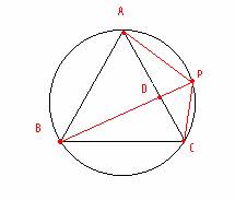 2.- BAD y CDP son semejantes, así como BDC y ADP ya que existe una propiedad que dice que en una circunferencia circunscrita a un triángulo, coinciden la bisectriz de un ángulo y la mediatriz del lado opuesto. La mediatriz de AC corta a la circunferencia en B y PB pasa por el vértice opuesto y por B luego es la bisectriz de el ángulo APC, que mide 120º por propiedades del arco capaz, luego DPC=DPA=60º y por tanto tienen los tres ángulos iguales.