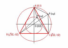 Si centramos el triángulo equilátero en los ejes cartesianos y dando al radio de la circunferencia circunscrita valor 1, el de la inscrita tendría valor 1/2, obtenemos: