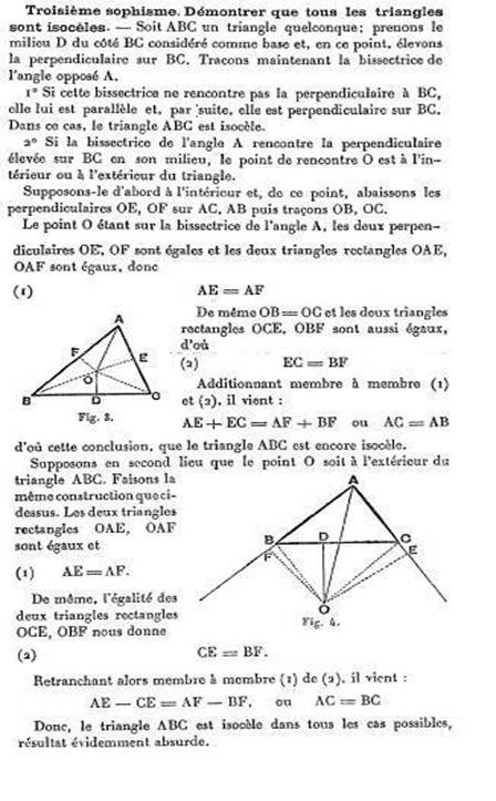 Sofisma tercero. Demostrar que todos los triángulos son isósceles. Sea ABC un triángulo cualquiera. Tomemos el punto medio D del lado BC considerándolo como base, y tomemos por D la perpendicular a BC: Tracemos ahora la bisectriz del ángulo opuesto A.