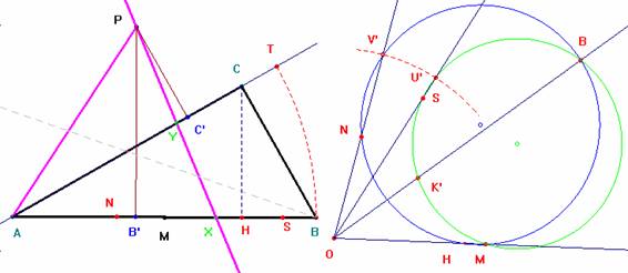 Fijando AY = AB, calculo X=S como sigue: tomo OK’ = PC’; OB = AB y OU’ = OV’. De este modo la semirrecta OU’ corta a la circunferencia que pasa por K’ , M y B (de color verde) en el punto S buscado. Llevo este segmento sobre el lado AB, OS = NS y ya está sobre el triángulo ABC una solución particular de la ecuación (2): los puntos X =S e Y=T que, como era de esperar, no están alineados con P.