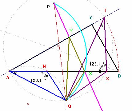 Para la solución (X,Y) alineada con P se tiene la misma relación: el triángulo XQY es semejante al NQA, así pues, el punto X pertenece al arco capaz de QP y amplitud el ángulo <QST= <QNA; además, pertenece al lado AB. El arco capaz y su corte con el lado AB nos da X.