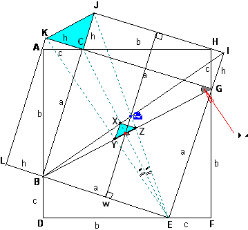 En la forma que es usual de demostrar el teorema de Pitágoras, hacemos las siguientes construcciones.