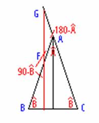 Es evidente por construcción que GFA=(BAC/2) y por tanto vale 90-B y FAG es igual a 180-A, luego puesto que 2B+A=180º, 180º=90-B-180+A+FGA; FGA=270-A+B, y al cambiar A=180-2B, obtenemos que FGA=GFA=90-B por lo tanto AFG es isósceles ya que tiene dos lados iguales.