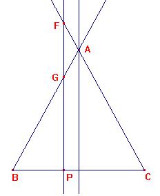 2. Por cualquier punto de la base BC de un triángulo isósceles ABC se levanta una perpendicular que corte a los otros dos lados (o sus prolongaciones) en F y G.