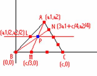 La recta AM es a2(x-c/3)-(a1-c/3)y=0 y la recta BN es igual a a2x-(3a1+c)y=0, y restando a AM BN, se obtiene lo pedido, luego es evidente que LP es paralelo a BC.