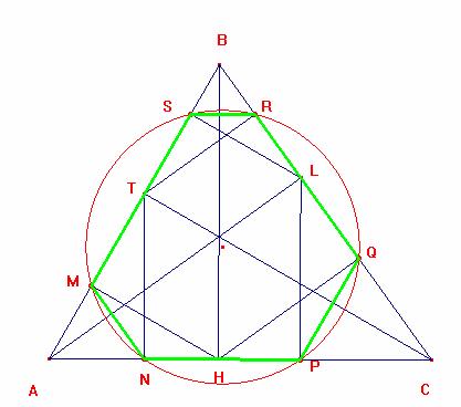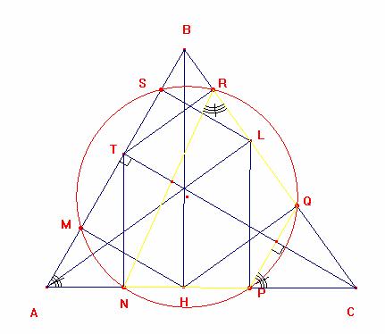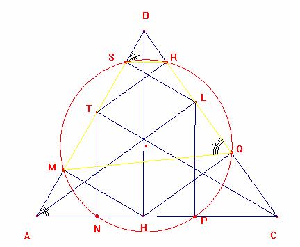 De la misma manera se demuestra que el cuadrilátero MQRS es inscriptible luego los puntos M, Q, R y S también pertenecen al a circunferencia que pasa por los puntos P, Q, R y S finalmente los puntos M, N, P, Q, R y T pertenecen a una misma circunferencia entonces el exágono MNPQRS es inscriptible.
