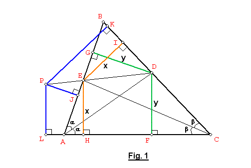 DE se toma el punto P, desde el cual trazamos las perpendiculares PJ, PK y PL sobre