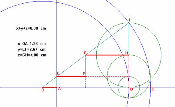 De este modo trazando paralelas al lado OA sobre estos puntos de división, obtenemos en el segmento OI los puntos E y G, que determinan los triángulos rectángulos OAE, EFG y GHI.