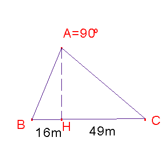 ¿Tendrá dinero suficiente un albañil con 6.000 euros para colocar una tapia a un solar de forma triángulo rectángulo si el metro de tapia importa 30 euros? ¿Qué dinero le sobrará o le faltará? Las medidas del solar son las del dibujo, es decir, la altura sobre la hipotenusa la divide en dos segmentos de 16 m y 49 m.