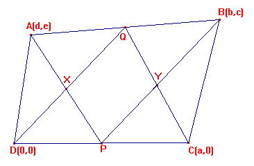 Sean ABCD un cuadrilátero cualquiera, P y Q los puntos medios de los lados opuestos DC y AB respectivamente. Sea X la intersección de los segmentos DQ y AP e Y la intersección de QC y PB. ¿Qué relación hay entre las áreas del cuadrilátero PXQY y la de los triángulos ADX y BCY?