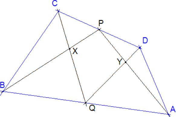 Hemos demostrado que la suma de las áreas de los triángulos BXC y AYD es igual al área del cuadrilátero PXQY. | ||