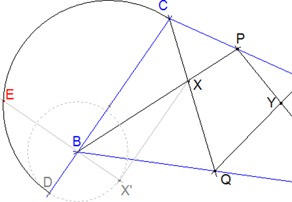 Area CBX = ½CBBX’. Extendemos CB hasta CD con BD = BX’. Trazamos la perpendicular a CD por B. La intersección E de esa perpendicular con el círculo de diámetro CD cumple: CBBD = BEBE = CBBX’. BE es el cateto del triángulo rectángulo isósceles cuya área es igual a la del triángulo dado BXC. | ||
