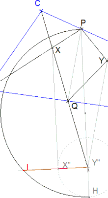 SEGUNDO PASO Convertir el triángulo XPY” en un triángulo rectángulo isósceles de igual área. Recordando el primer problema previo: Extendemos PY” hasta PH con Y”H = Y”X”. Perpendicular en Y” a PH. Obtenemos I en la intersección de la perpendicular con el círculo de diámetro PH. PY”Y”H = Y”IY”I. Y”I es el cateto del triángulo buscado. | |