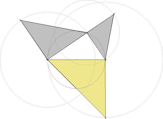 Sin palabras: Sólo basta recordar el teorema de Pitágoras. Los triángulos dados son los triángulos grises. El triángulo solución, el amarillo. | ||