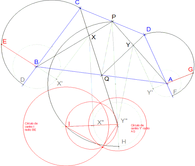 Comprobamos (tercer problema previo) que los tres catetos hallados forman un triángulo rectángulo de catetos BE y AG e hipotenusa Y”I (Intersección te círculos rojos). | |