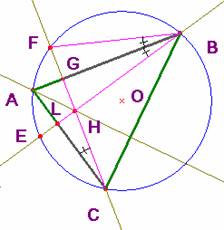 126.- Sean el círculo circunscrito a un triángulo ABC y H el punto de encuentro de las alturas. Si se prolonga la altura CG hasta F se tendrá: HG =GF.(Traducción literal del editor. Se precisa que G es el punto de corte de la altura desde C con el lado AB o su prolongación. F es el punto de corte de la altura con la circunferencia circunscrita. )