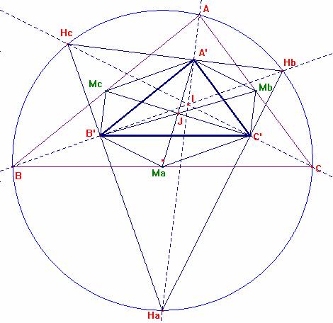 Así el triángulo A'B'C' es el homotético del original ABC con centro de homotecia el punto I (=incentro del ABC y ortocentro del Ha Hb Hc) y razón k=1/2.