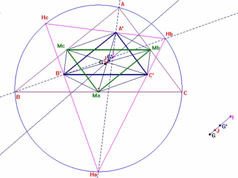 Como ya se ha probado en el apartado anterior, el punto J ejerce de centro de simetría del triángulo A'B'C' respecto del MaMbMc y así ocurrirá también con los respectivos baricentros G' y G de ambos triángulos. Señalemos que el punto G, baricentro del triángulo ABC es el mismo baricentro para su triángulo medial MaMbMc .