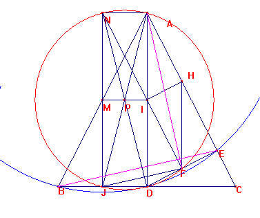 perpendicular a AB, ambas se cortan en N: NIF están alineados, pues NI es paralelo a AH y IF es a AE.
