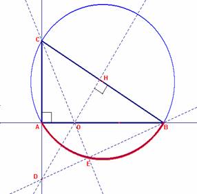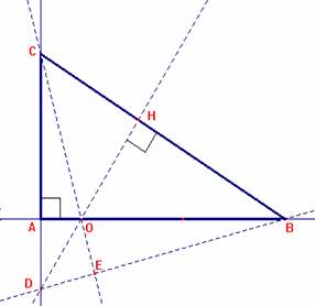 Sea ABC un triángulo rectángulo en A. Por un punto O del cateto AB trazamos la perpendicular OH a la hipotenusa BC. Sea D el punto de intersección de la recta OH con la recta AC. Tracemos BD. Sea E el punto de intersección de la recta BD con la CO.