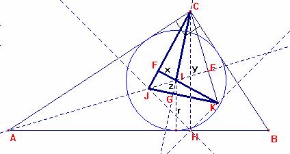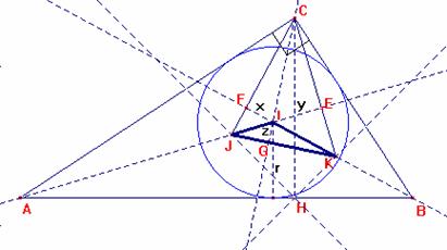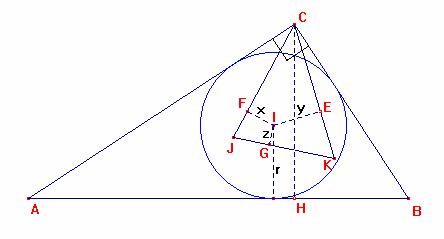 El triángulo ABC es recto en C, CH es altura, I, J y K son incentros de los triángulos ABC, AHC y BHC. Si x = IF, y = IE, z = IG son las distancias desde I hacia JC, KC y JK, respectivamente. Demostrar que: