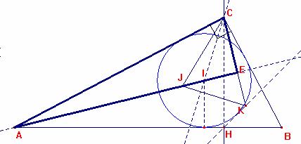 Analizada la situación dada, observamos que I es el ortocentro del triángulo CJK. Esto es así ya que, al ser K el incentro del triángulo BHC, entonces <KCB=A/2. Así el ángulo <ACK= 90º-A/2. Por tanto, las rectas AJ (=JI) y CK se cortan perpendicularmente. Este punto de corte no es otro que el punto E.