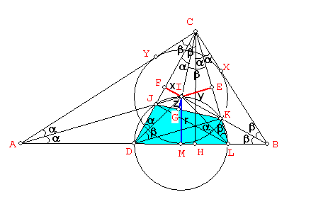 Por expuesto tenemos que AJ y son BK son bisectriz y mediatriz en los triángulos isósceles CAL y DBC, y se cortan en I, incentro del triángulo ABC respectivamente, entonces las distancias IE, IF desde I hacia CK y CJ son segmentos contenidos en las rectas AJ y BK respectivamente, donde: