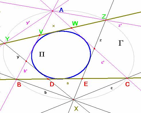y XYZ son ambos inscritos en la cónica G, y por el teorema 1 , sus lados son tangentes a otra cónica P. Cinco de los lados AB,