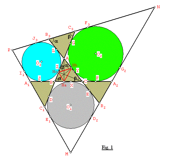 Consideramos la configuración completa, donde tenemos las tangentes interiores y exteriores a los excírculos del triángulo ABC (Ver Fig. 1).