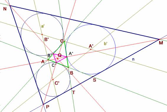 triángulos A*B*C* y MNP tienen sus lados paralelos son homotéticos y Q, el centro de esa homotecia, es el punto