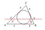 B´C/BC=A´C/AC (Por el teorema de Tales), y como B´C=x/2+y+j, A´C=x/2+z-j BC=x+y y AC=x+z y resolviendo el sistema en función de x, y y z y utilizando que x+y=a, x+z=b y y+z=c, obtenemos que j=c(a+b-c)/4(a+b)