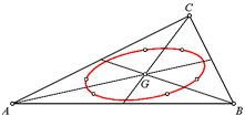 elipse de los baricentrosEs conocido que las medianas de un triángulo T dividen a éste en seis triángulos de la misma área, y que los baricentros de estos seis triángulos están en una elipse centrada en el baricentro del triángulo T. Cabe preguntarse para qué triángulos dicha elipse contiene también a otros puntos notables del triángulo.