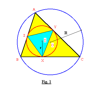 En un triángulo ABC de circunradio R, el círculo inscrito de radio r determina el triángulo XYZ, donde X, Y, Z son los puntos de tangencia del incírculo con los lados BC, CA, AB. Demostrar que: