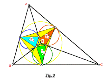 En un triángulo ABC, su incírculo (I, r) determina un triángulo tangencial interno de área S, igualmente los incírculos (I1, r1), (I2, r2), (I3, r3) de los triángulos IBC, AIC, BIA determinan triángulos tangenciales internos de áreas S1, S2, S3 respectivas en cada triángulo (Ver Fig. 3). Demostrar que: ![]()