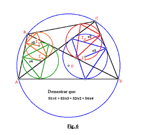 Sea el cuadrilátero ABCD inscrito en un círculo. Los círculos inscritos (I1,r1), (I2,r2), (I3,r3), (I4,r4) en los triángulos ABC, BCD, CDA y DAB, determinan los triángulos tangenciales internos de áreas S1, S2, S3 y S4 respectivamente.