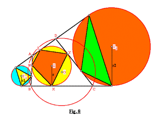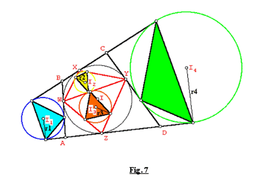 Sea el cuadrilátero ABCD circunscrito a un círculo (I, r). Los círculos exinscritos (I1,r1), (I4,r4) correspondientes a los lados AB y CD y los círculos inscritos (I2,r2), (I3,r3) en los triángulos WXY y WYZ respectivamente, determinan los triángulos tangenciales externos e internos de áreas S1 , S2, S3 y S4 correspondientes. Donde W, X, Y, Z son los puntos de tangencia del incírculo de ABCD sobre los lados AB, BC, CD, DA respectivamente.