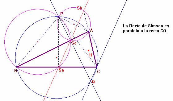 En definitiva, los puntos Sa, Sb y Sc están alineados (Recta de Simson) y ésta es paralela a la recta CQ, c.q.d.