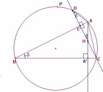 Dem.- Sea C' el pie de la altura correspondiente al vértice C. Si prolongamos esta altura hasta cortar de nuevo a la circunferencia K, obtenemos el punto D.