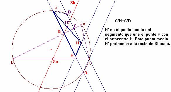 En el triángulo PHR, la recta de Simson, SaSbSc es la paralela media al lado HR, y así H' es el punto medio del segmento PH, c.q.d.