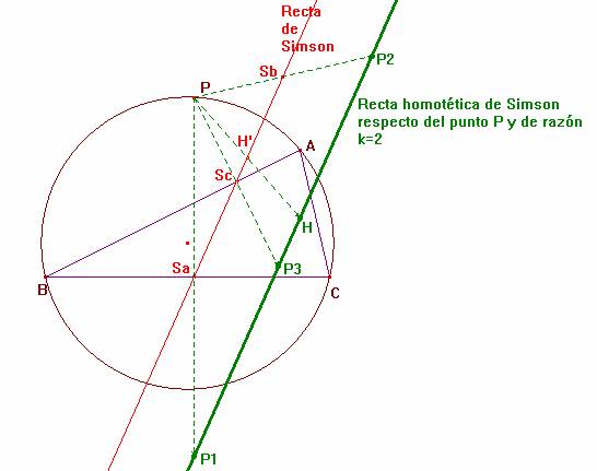 En definitiva, los puntos P1, P2 y P3 se encuentran sobre la recta paralela a la de Simson que pasa por el punto H, ortocentro del triángulo ABC.