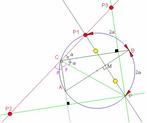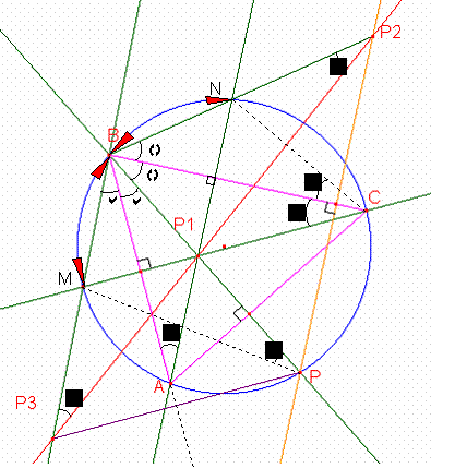 Observemos que CB y CA son bisectrices luego al trazar perpendiculares desde el punto P a dichas bisectrices se determinaran triángulos isósceles donde las bases son cortados en el punto medio por las bisectrices respectivas y como las bisectrices también son mediatrices de las bases entonces los puntos P2 y P3 son simétricos respecto de las bisectrices que a su ves son lados del triángulo ABC finalmente los puntos P1, P2 Y P3 están contenidos en la recta que pasa por el ortocentro del triángulo ABC