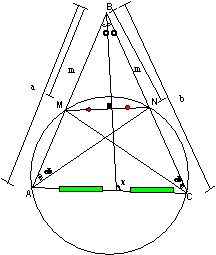 Solución: Observamos que el cuadrilátero AMNC es inscriptible, peor el triángulo MBN es isósceles entonces MB=BN=m, luego aplicando teorema de la secante (relaciones métricas) obtenemos: a.m=b.m........... (1) Finalmente a=b. por lo tanto el triángulo ABC es isósceles y el ángulo x = 90º También observaremos que las diagonales AN y CM se cortan en un punto que pertenece a la bisectriz del ángulo B |