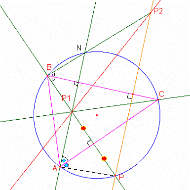 El simétrico de este punto respecto del segmento AC observaremos que es el punto de intersección de las alturas (el ortocentro P1) luego al trazar la perpendicular al segmento BC corta a este en el punto P2 que resulta ser el simétrico de este punto respecto del lado BC pues observamos que BC es bisectriz del ángulo PBN (consideraciones iniciales 2) pro lo tanto también es mediatriz luego P2 es simétrico de P respecto de BC