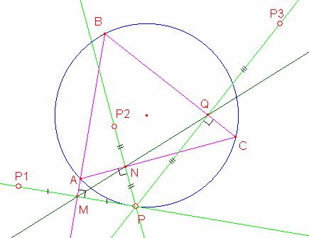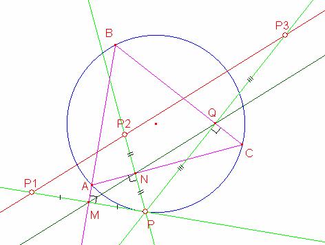 También MN es base media por lo tanto MN//P1P2 de la misma manera NQ es también base media del triángulo P2PP3 luego P2P3//NQ finalmente los punto P1, P2 y P3 son colineales.