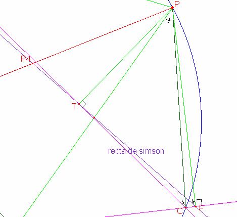 Bien si observamos detenidamente los ángulos ODM y TFC estos ángulo son iguales por complementos de los ángulo iguales MOD y DPF que miden α cada uno esto nos indica que la recta de simson y el segmento OD son paralelos pero en el triángulo rectángulo DPF FR es su mediana relativa a la hipotenusa por lo tanto DR=RP=RF con lo que se demuestra que el punto R es punto medio del segmento PD finalmente en el triángulo OPD como R es punto medio de PD y la recta de simson pasa por el punto R y es paralelo al segmento OD cortara al lado PO en P4 que será punto medio de dicho lado