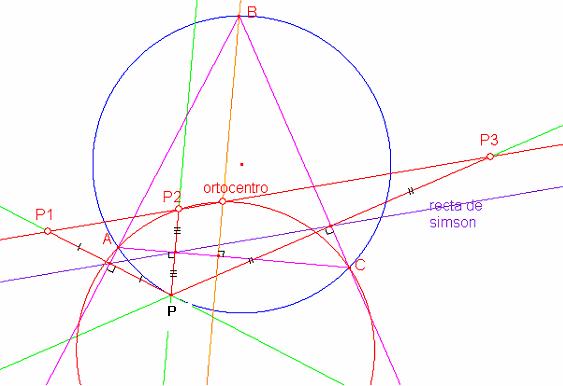 Ahora sabemos los segmentos P1P, P2P y P3P son cortados por la recta de simson en su punto medio entonces como el ortocentro y el punto P también son cortados en el punto medio por la recta de simson necesariamente los punto P1, P2, P3 y O tendrán que ser colineales (pues la relación entre los segmento de terminados por la recta de simson es constante).