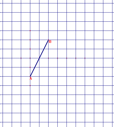 AB es uno de los lados iguales de un triángulo isósceles que tiene los tres vértices sobre las intersecciones de las líneas del papel. Completa el triángulo. ¿Cuántos hay diferentes? Vighi, P. (2004): The geometry of squared paper. ICME 10. |