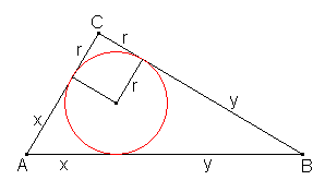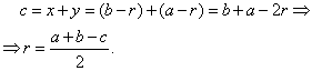 Usando esta otra figura, podemos expresar con facilidad el radio de la circunferencia inscrita en un triángulo rectángulo: