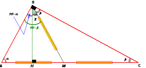 Trazamos la mediana BM luego se cumple que AM=MC=BM finalmente del gráfico obtenemos: x + 90 – α = 90 - b … resolviendo obtenemos: x = α - b